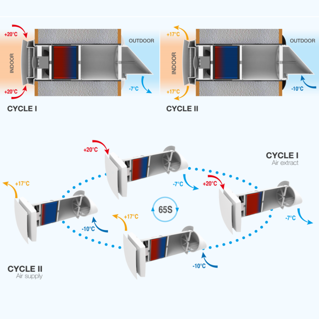 Aerul proaspăt, dar rece, din exterior trece prin regeneratorul de căldură și absoarbe căldura și umiditatea acumulate, astfel încât temperatura fluxului de aer introdus să fie apropiată de cea a încăperii. În 65 de secunde, când regeneratorul de energie se răcește, ventilatorul trece în modul de extracție a aerului. Ciclul reîncepe de la început.
