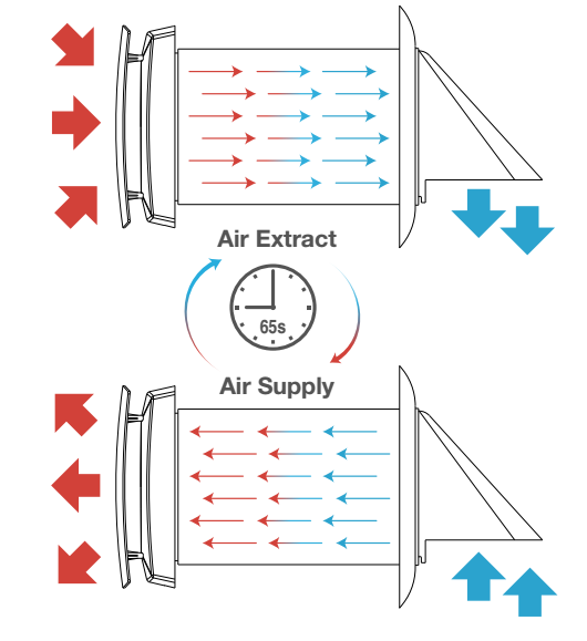 Aerul cald și poluat este extras din încăpere și, trecând prin regeneratorul ceramic de energie, recuperatorul absoarbe căldura și umiditatea. În 65 de secunde, pe măsură ce regeneratorul de energie se încălzește, ventilatorul trece automat în modul de introducere a aerului.