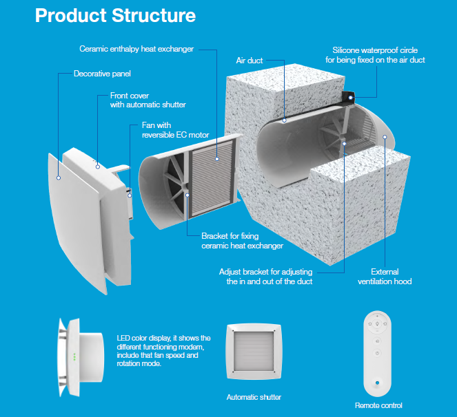 Ventilatorul este conceput pentru a asigura un schimb mecanic continuu de aer în case, birouri, hoteluri, cafenele, săli de conferințe și alte spații rezidențiale și publice. Acesta este echipat cu un schimbător de căldură ceramic, care permite introducerea aerului proaspăt filtrat, încălzit prin regenerarea căldurii din aerul extras.